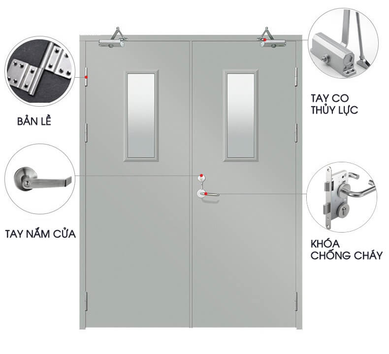 + Các phụ kiện đi kèm gồm ổ khóa, thanh thoát hiểm, kính chống cháy, tay co thủy lực…