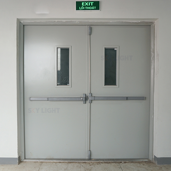 Cửa thép công nghiệp 2 cánh có ô kính thanh thoát hiểm