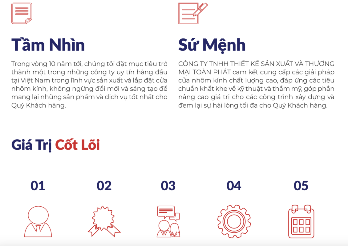 Tại TOÀN PHÁT, chất lượng luôn đặt lên hàng đầu, với mong muốn xây dựng một mối quan hệ đồng lòng và bền vững với khách hàng và đối tác. Với sứ mệnh đó, chúng tôi cam kết không ngừng nỗ lực để cải thiện dịch vụ, đồng thời góp phần vào sự phát triển bền vững của ngành công nghiệp thi công và lắp đặt cửa nhôm kính tại Việt Nam.